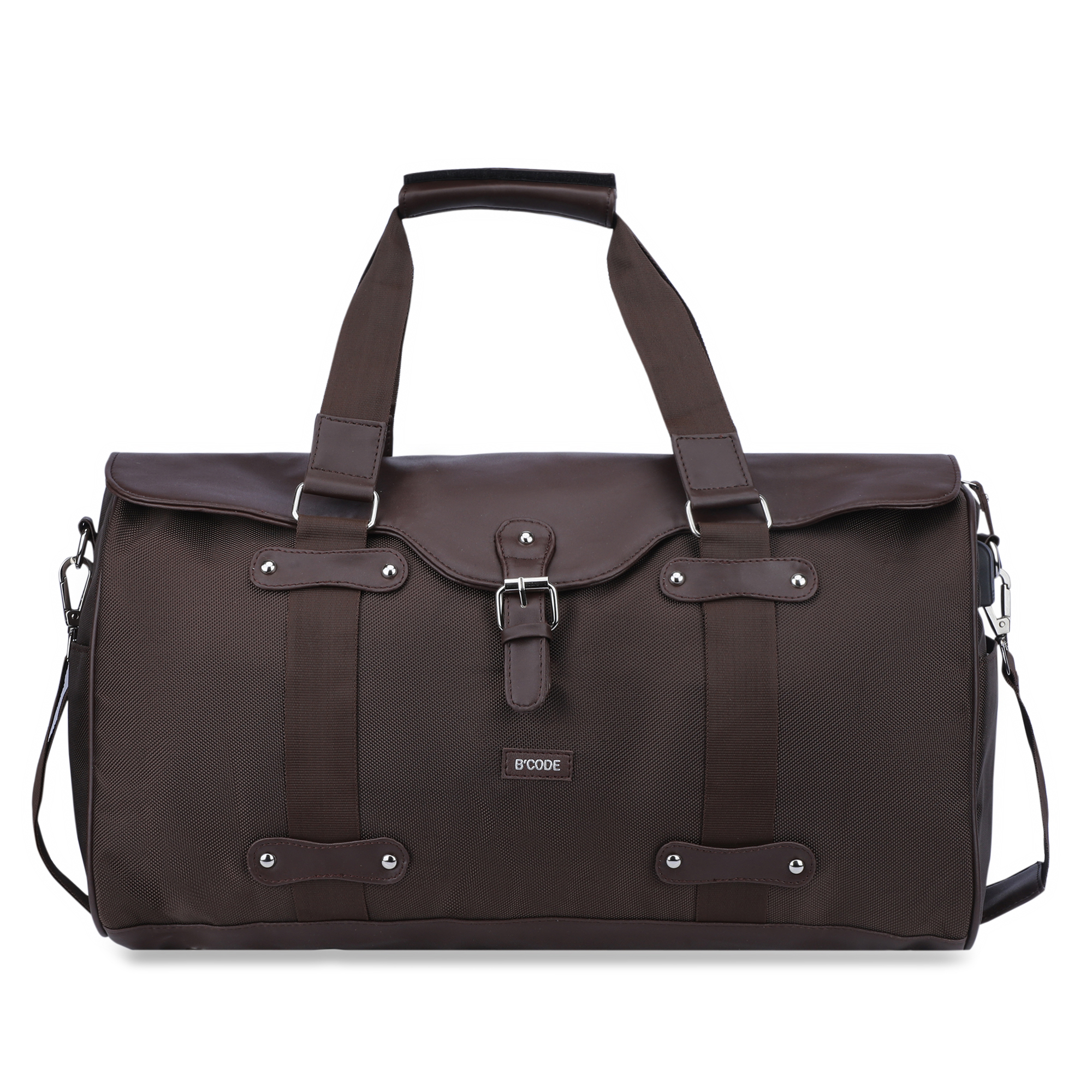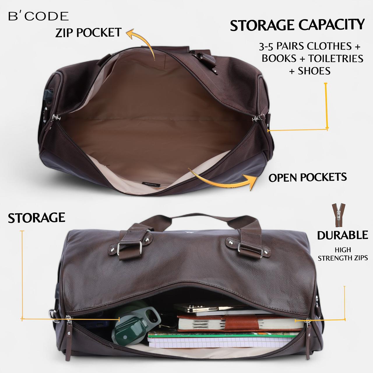 Introducing the Techno Travel Duffel Bag with Wireless Charging, a versatile and stylish companion for your adventures. Crafted with premium vegan leather in a rich brown hue. Its spacious interior offers ample capacity with inside zip pocket and mobile pocket. while the nylon durable handles and two side pockets provide convenient access to your belongings. The backside trolley straps allow for effortless mobility, and the chain pocket on the back ensures your valuables remain secure. Elevate your travel experience with the integrated wireless charging feature, keeping your devices powered on the go. Meticulously designed for both men and women, this duffel bag combines functionality and style, making it the perfect choice for your next journey. Measuring 60 cm x 30 cm x 25 cm, it strikes the perfect balance between capacity and portability.